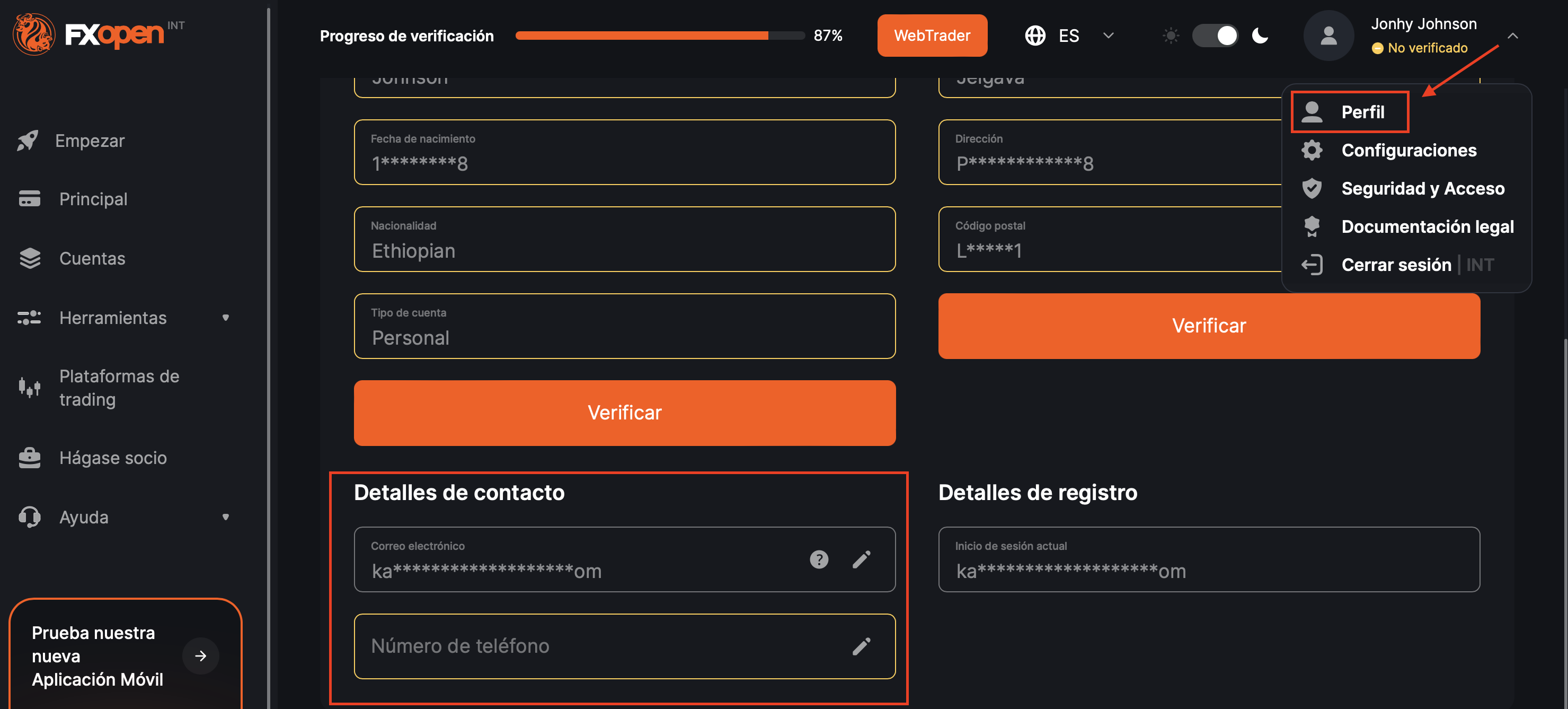 Para ello, ve a la sección Perfil en la parte superior del menú. Al final de la página, en la sección Detalles de contacto, realiza los cambios necesarios.