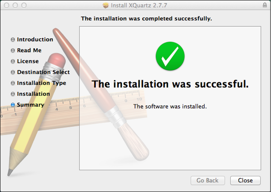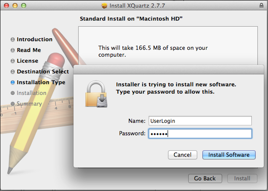 Instalasi XQuartz dilakukan dalam beberapa langkah. Bacalah 'informasi untuk pengguna' (Pendahuluan, Baca Saya) dan setujui ketentuan lisensi.