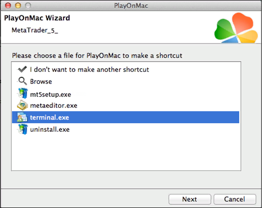 Setelah instalasi selesai, PlayOnMac akan meminta Anda untuk membuat pintasan untuk terminal trading MetaTrader dan MetaEditor: (terminal.exe) dan (metaeditor.exe), masing-masing.