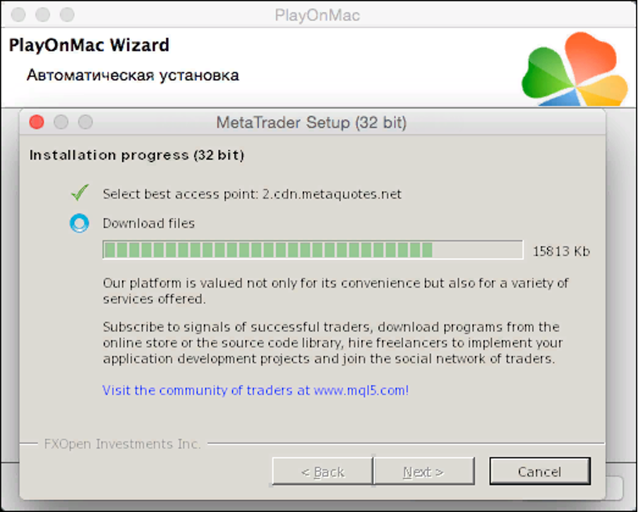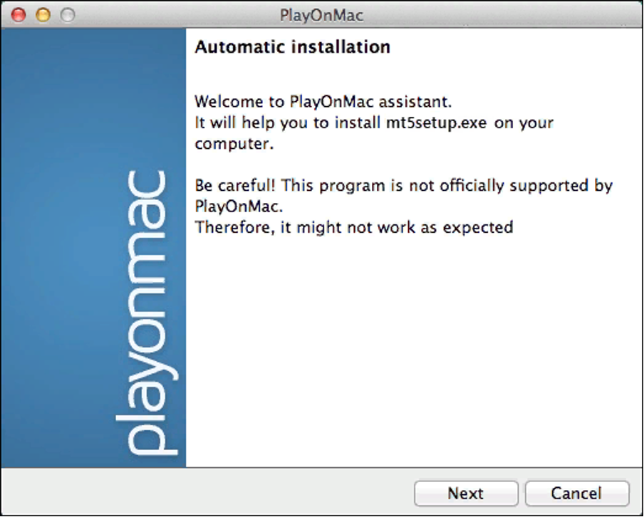Anda dapat menginstal MetaTrader 5 di Mac OS melalui aplikasi perangkat lunak gratis PlayOnMac. PlayOnMac adalah alat yang membantu pengguna Mac untuk dengan mudah menginstal dan menjalankan aplikasi yang awalnya dirancang untuk bekerja di Microsoft Windows melalui Wine. Wine berfungsi sebagai antarmuka pengguna (front-end). Harap diperhatikan bahwa Wine, seperti banyak perangkat lunak gratis lainnya, tidak menjamin stabilitas absolut. Beberapa fungsi dalam aplikasi yang Anda jalankan di bawahnya mungkin tidak berfungsi dengan benar atau aplikasi tersebut mungkin gagal berfungsi.