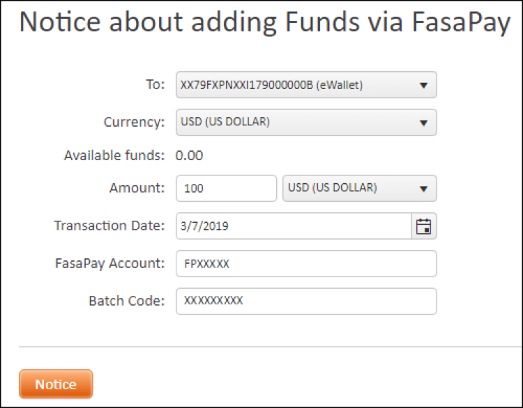 1. 在客户门户中选择"→ FasaPay添加资金",然后单击通知表单链接。